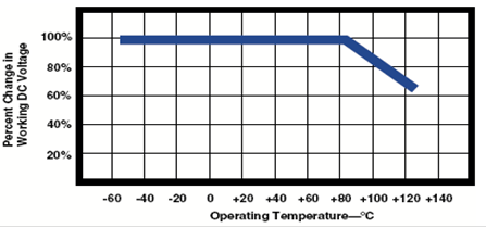 一般規(guī)格書上標示的工作電壓為在一定溫度范圍內最大直流電壓(低于85度),當溫度高于85度,額定電壓會降低,一般在125度,額定電壓降為原額定電壓的2/3。